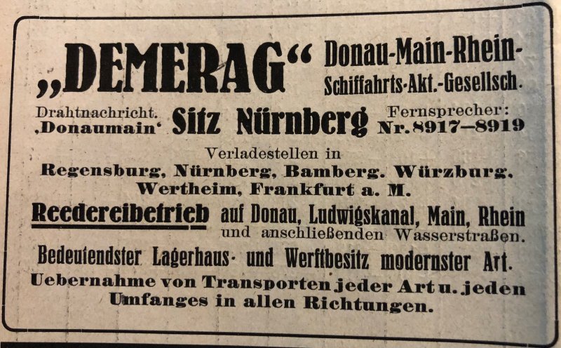 'Schöne' Demerag-Anzeige von 1919. Etwas verwirrt bin ich dass sich die Firma als Werftbesitzer bezeichnet... welche Werft sollte das denn gewesen sein...?!