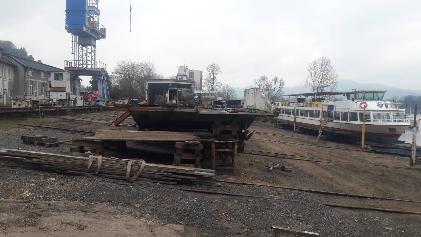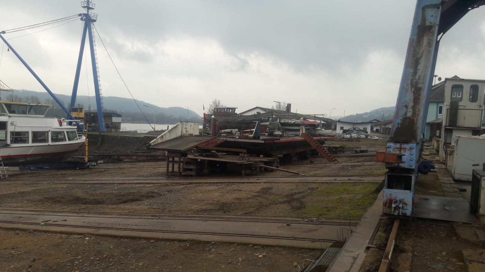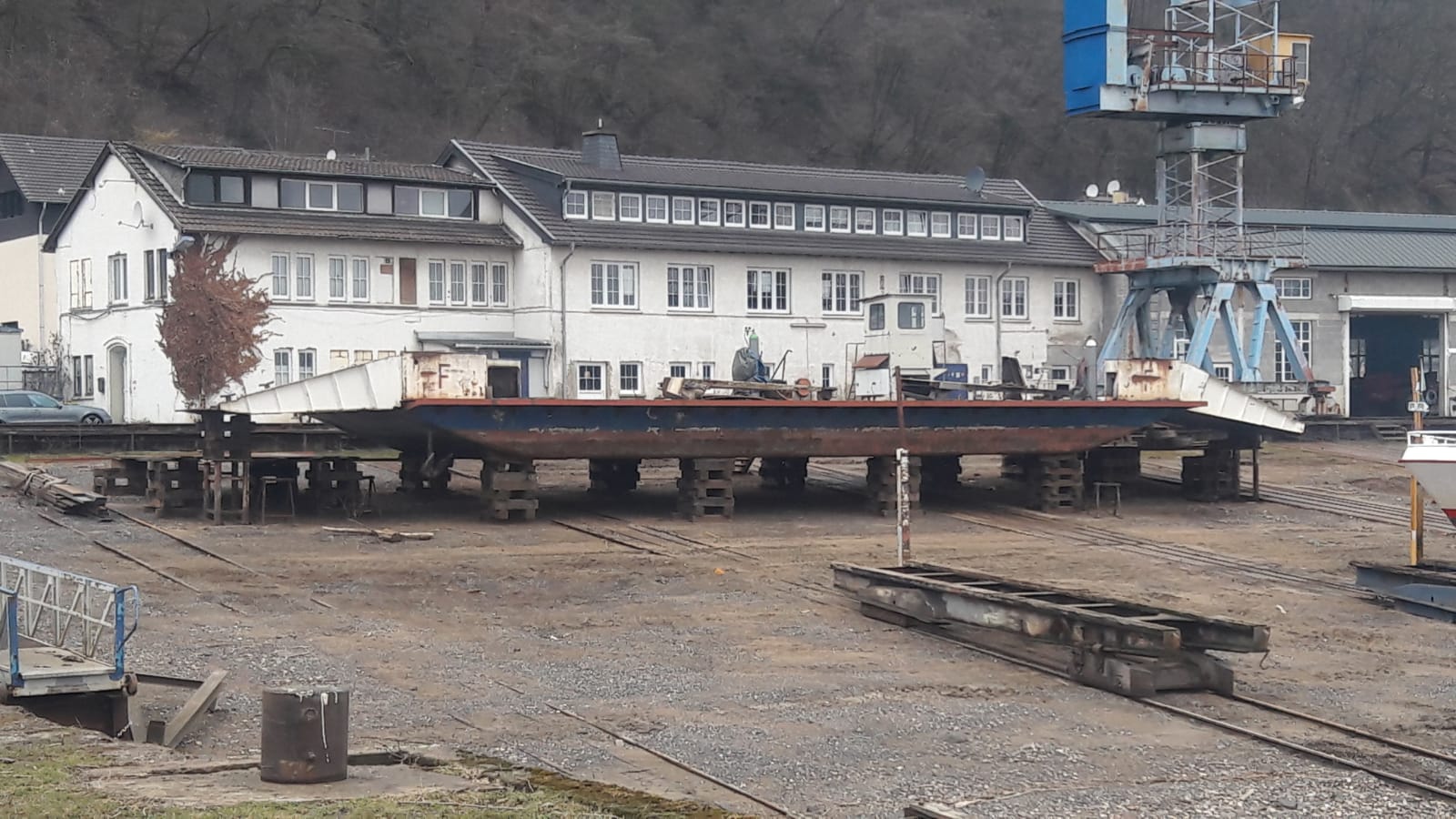"St. Michael" nicht mehr in Senheim, sondern in Briedern an der Werft von Kolb liegend ...