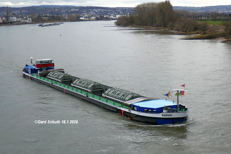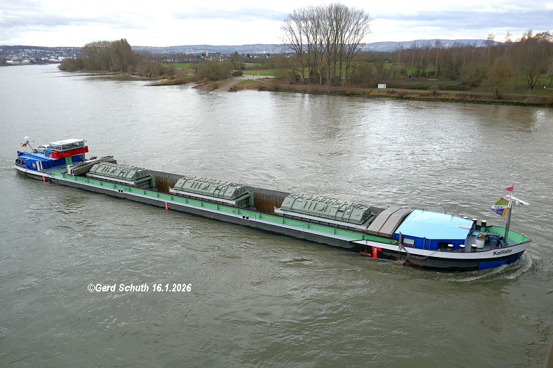 GMS KALLISTO mit besonderer Fracht von Siemens auf dem Rhein bei Engers/Urmitz zu Tal.
