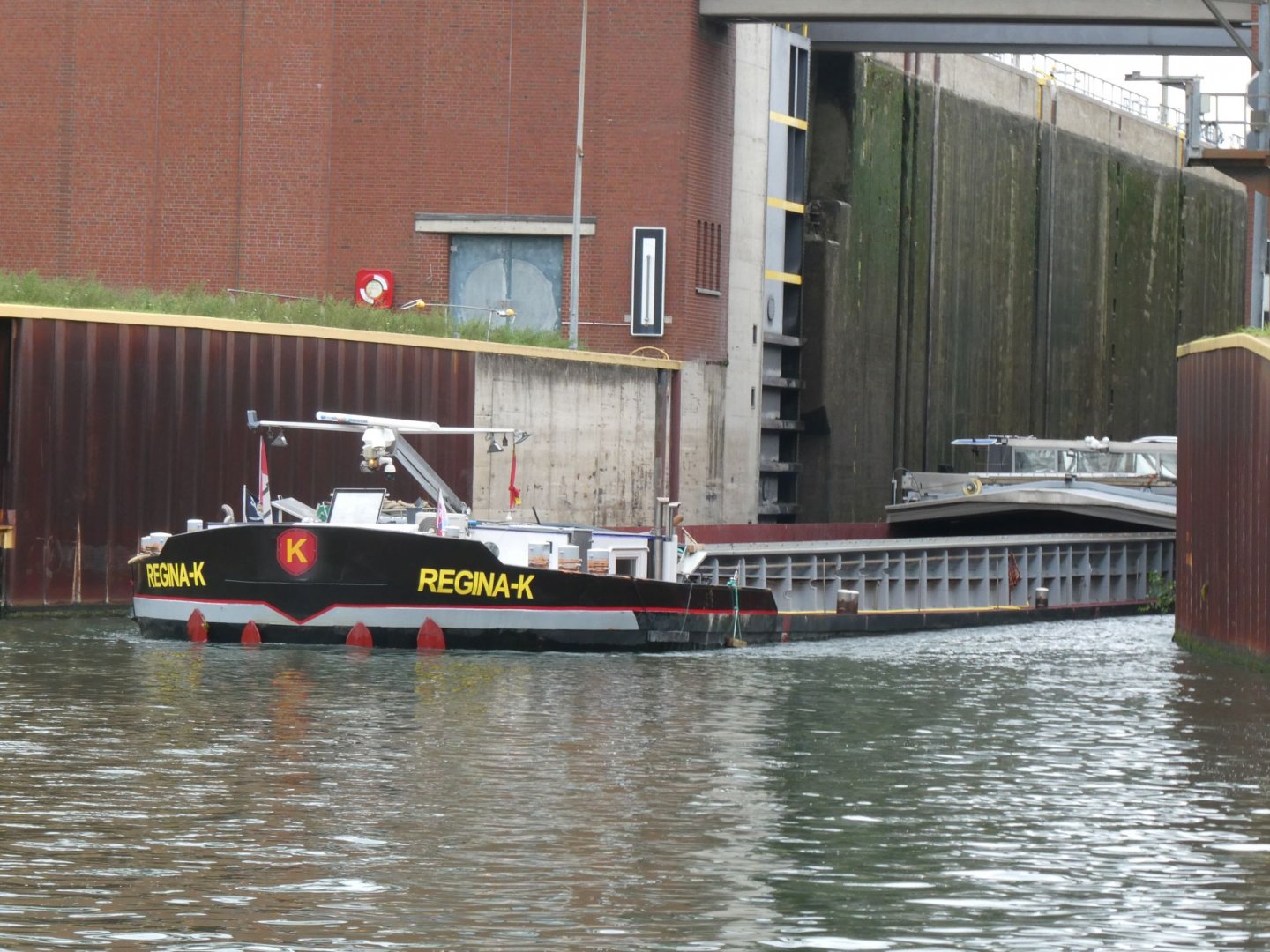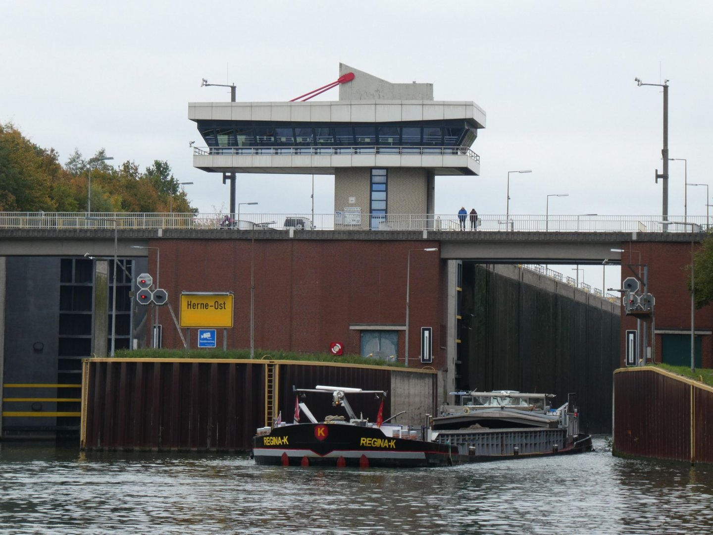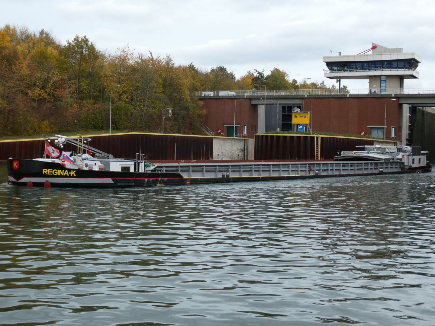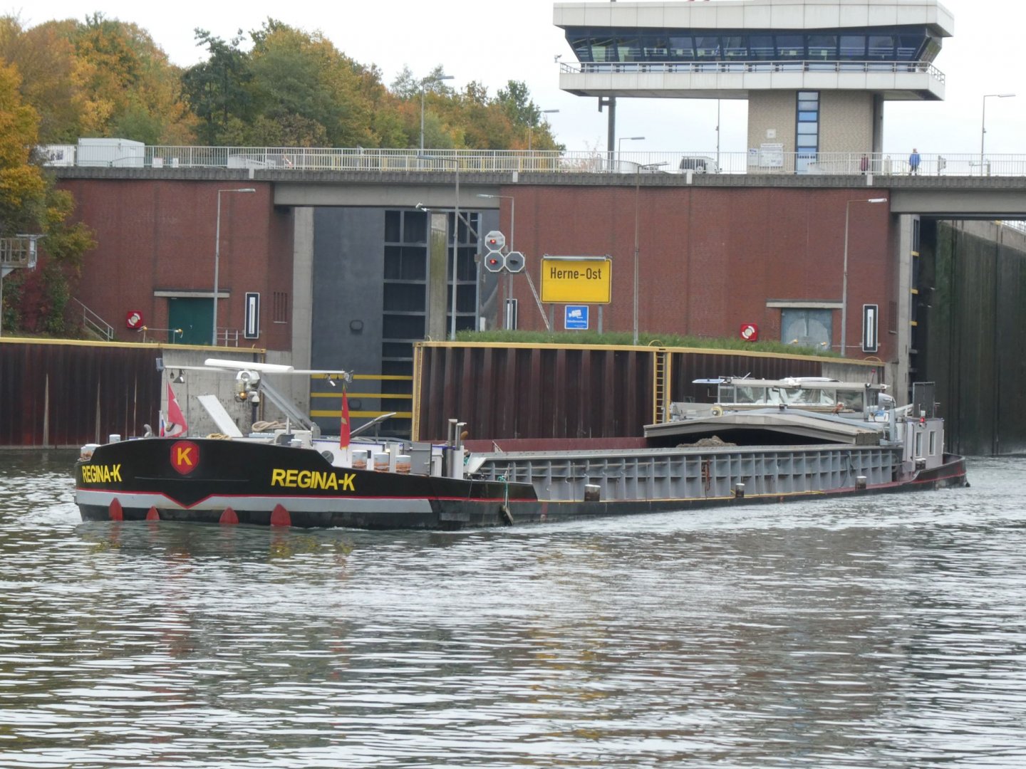 die Regina-K im Okt. bei der Ausfahrt aus der Schleuse Herne-Ost zu Tal.