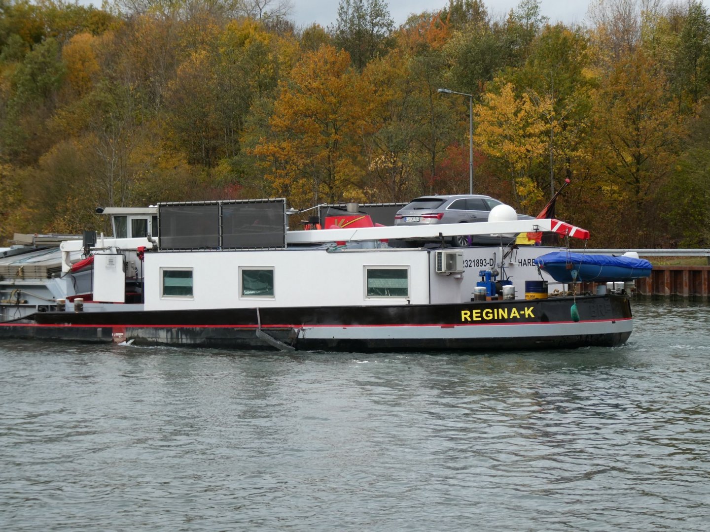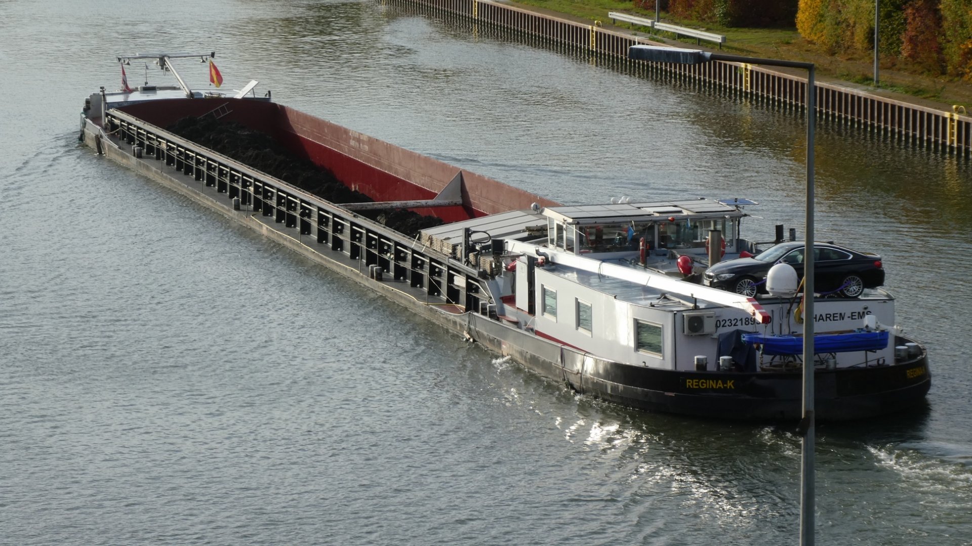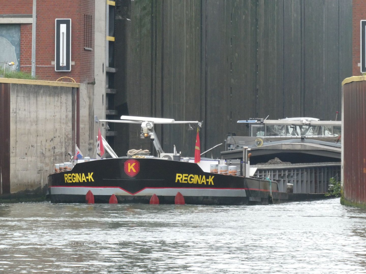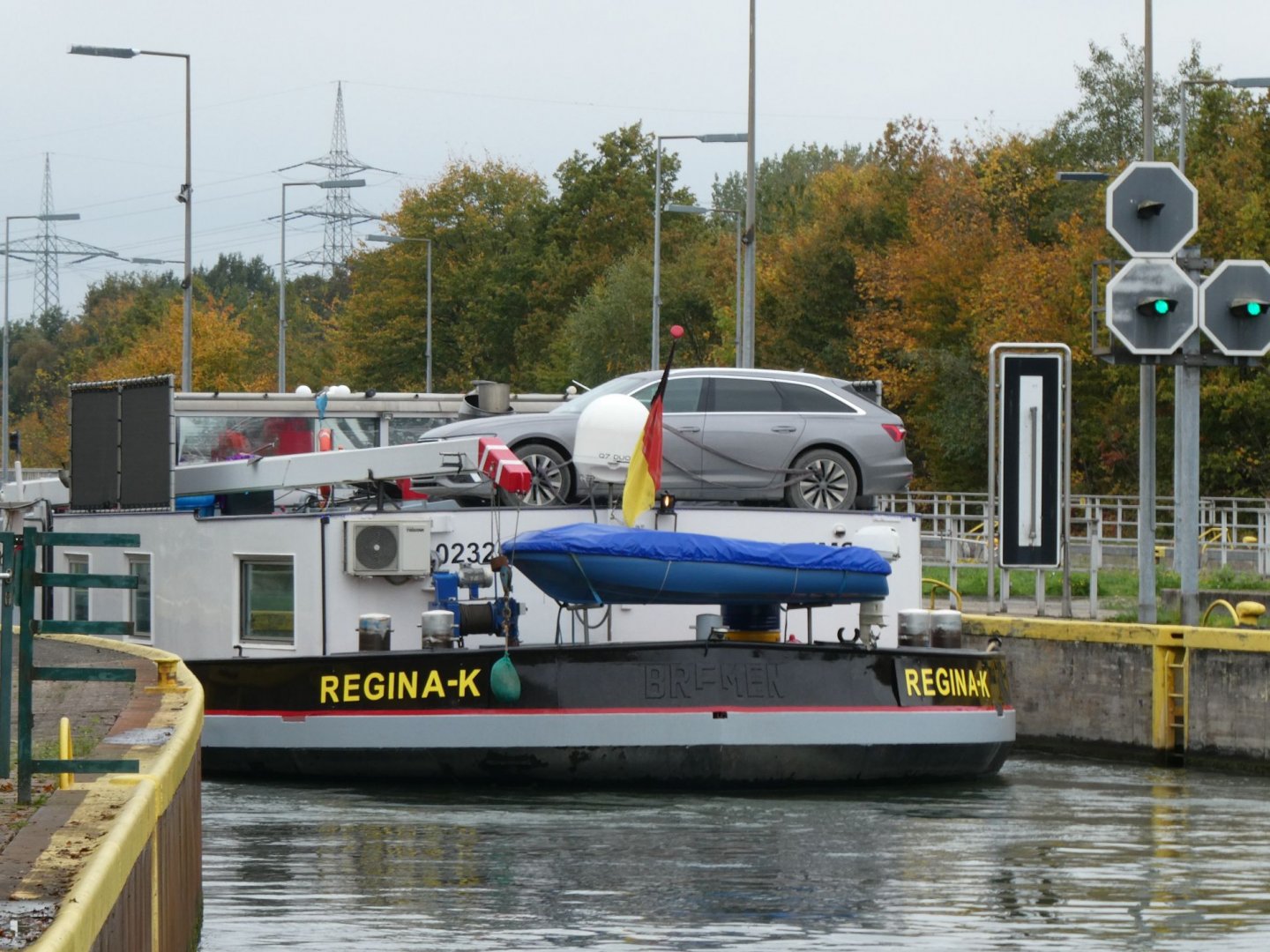die Regina-K im Okt. bei der Ausfahrt aus der Schleuse Herne-Ost zu Tal.