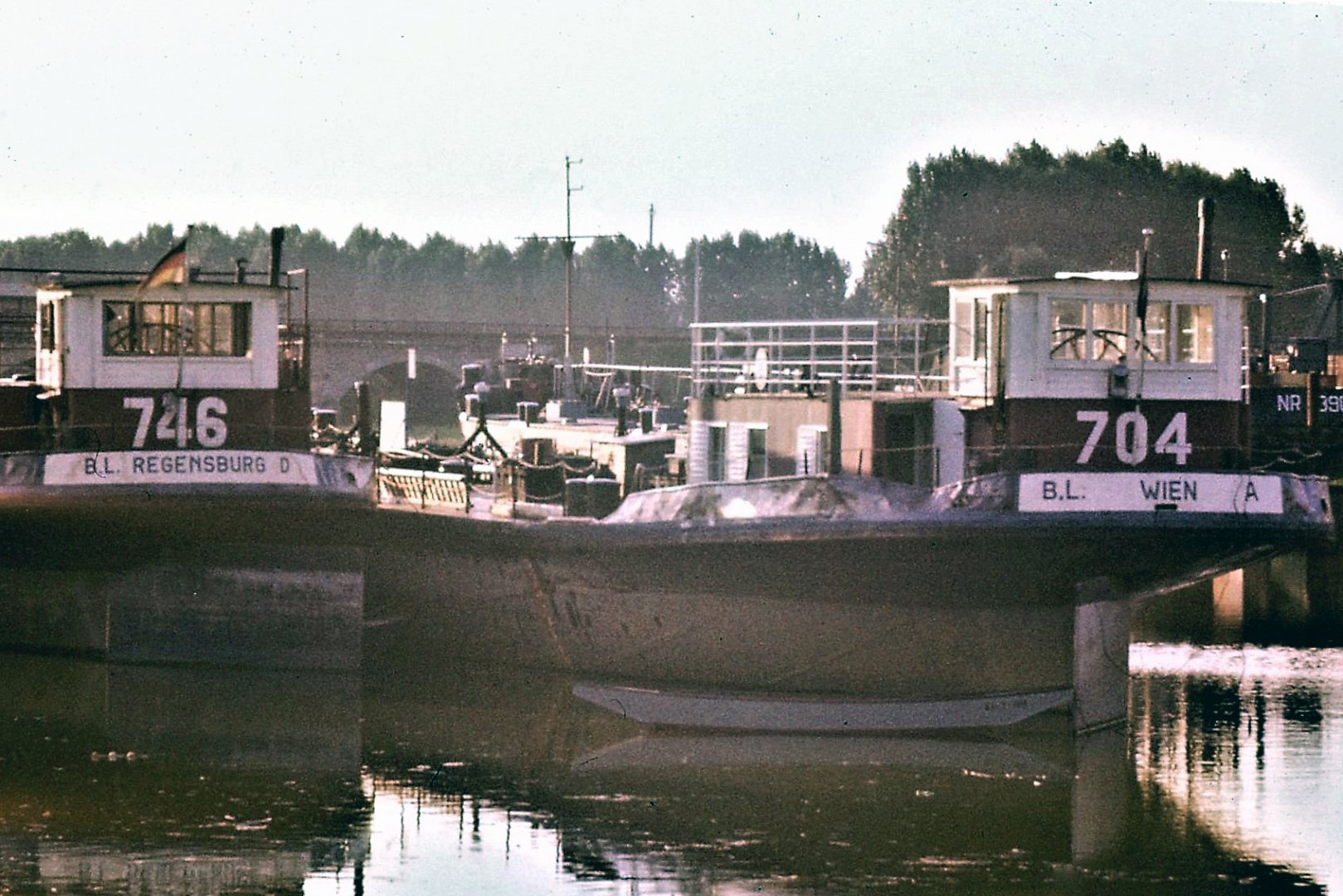 Ein Bild vom Sommer 1975, aufgenommen im Regensburger Ölhafen. Auf dem Bild der Tk BL 704 (II) - der erste 704 (ex WT 13) ist 1944 in Kladovo (Do.-km 933) zurückgeblieben. Möglicherweise ist BL 704 (II) einer der ehemaligen Wallner WT, die der Lloyd Anfang der 1970-er Jahre übernommen hat. Bemerkenswert aber ist, dass der 704 (II) in Österreich HO Wien gemeldet war. Was heute Tagesgeschäft ist, Schiffe aus (wirtschaftlichen Gründen) irgendwo registrieren zu lassen, war damals bemerkenswert. Kenne kein DDSG-Schiff welches vor dem Beitritt Österreichs zur EU im Ausland registriert war. Nun - die damaligen Hintergründe werden wir wohl nicht mehr aufklären können...
