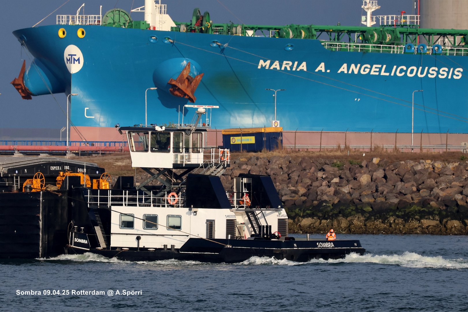 der "kleine" Niederländische Schuber Sombra vor dem mächtigen Bug des ULCC Maria A. Angelicouss.
