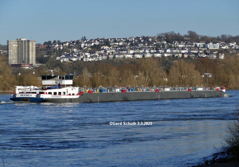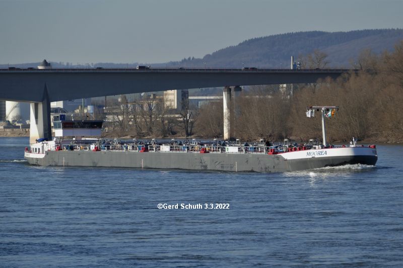Tanker MOOREA an der Rheinbrücke Urmitz/Engers bei hohem Wasserstand zu Tal (Pegel Koblenz knapp über 6,00 m zu diesem Zeitpunkt).