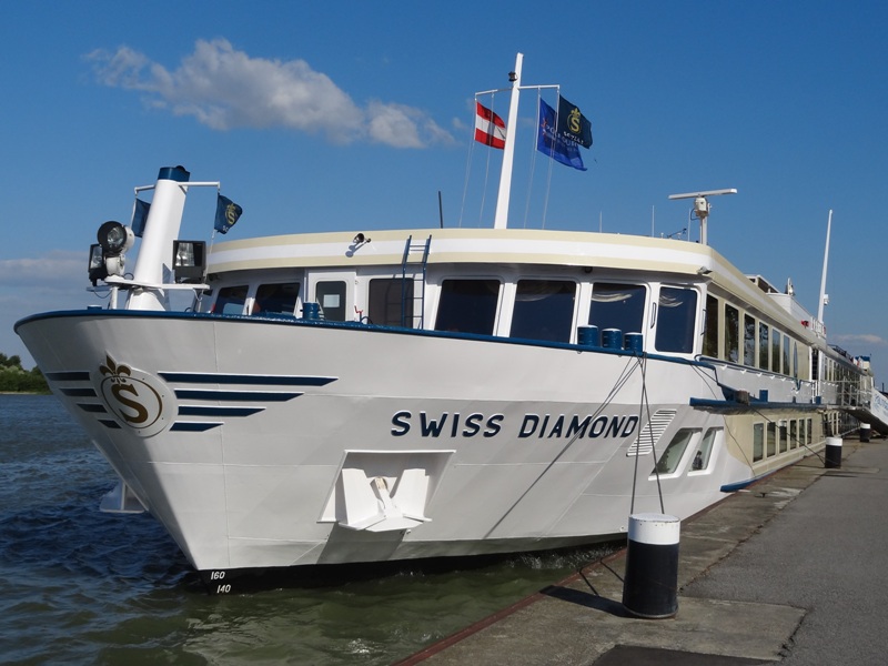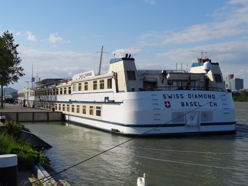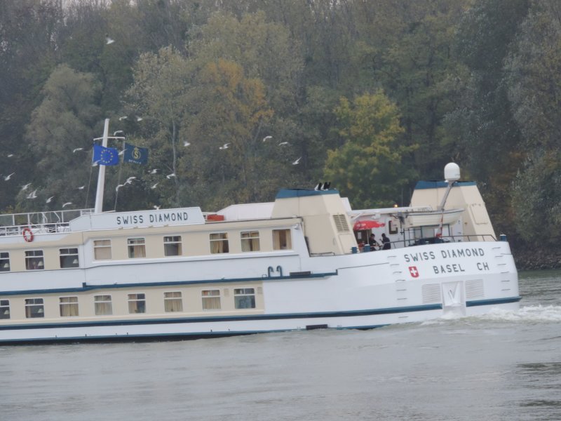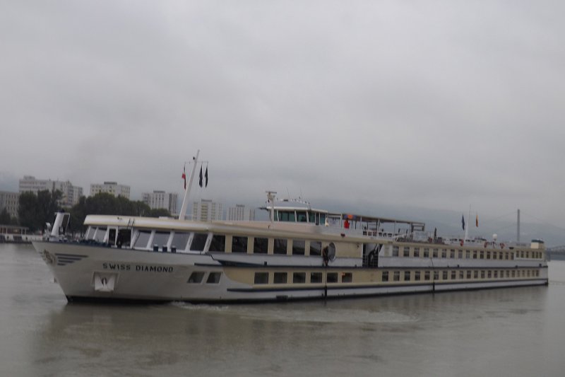 SWISS DIAMOND heute 19.Aug.2014 an der Linzer Donaulände,leider im strömenden Regen. Deshalb ist der Kapitän auch mit Regenschirm am Aussenfahrstand zu sehen !