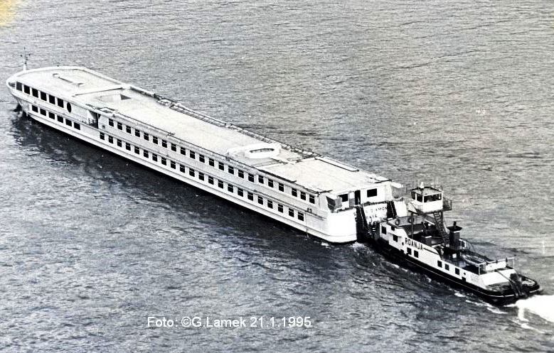 das Schubboot ROANJA schob das Kasko der SWISS DIAMOND am 21. Januar 1995 auf dem Mittelrhein zu Tal.