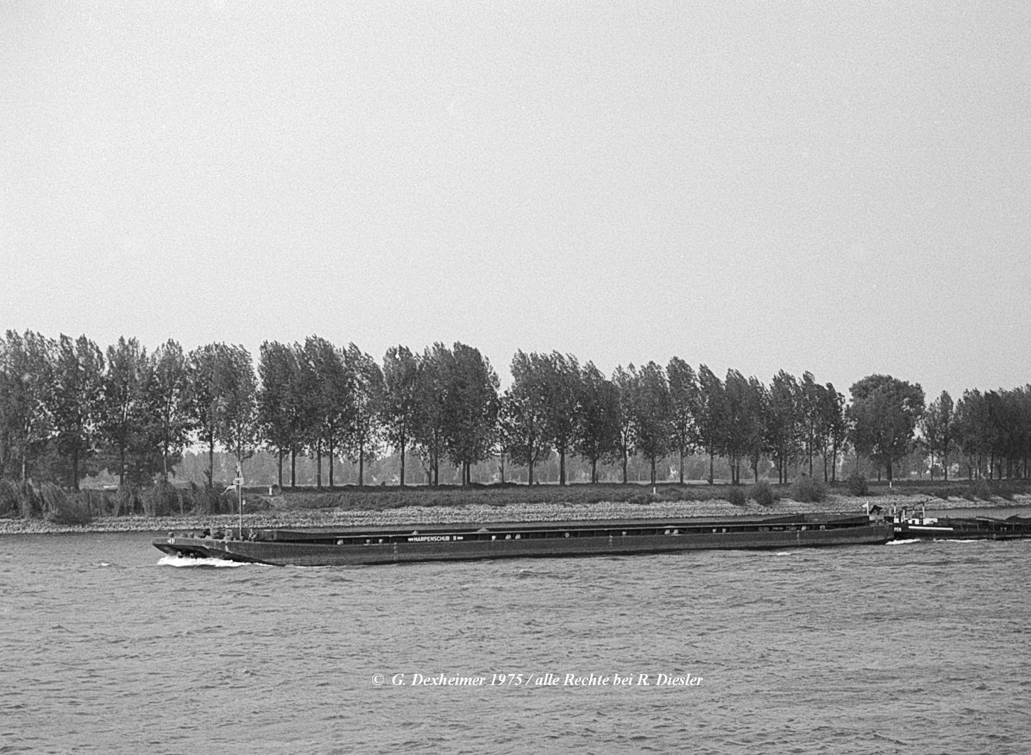 Harpenschub 11 wird am 12. Oktober 1975 vom Sattelschlepper Harpen 105 in Gernsheim zu Berg geschoben.