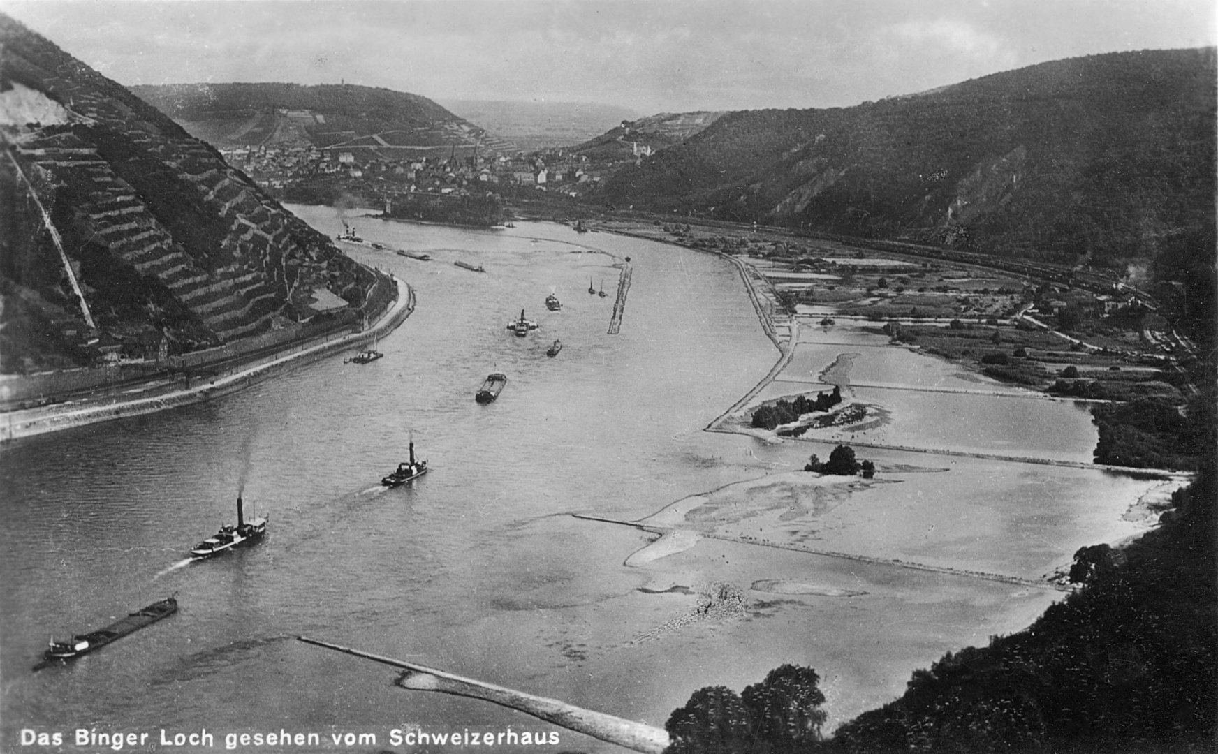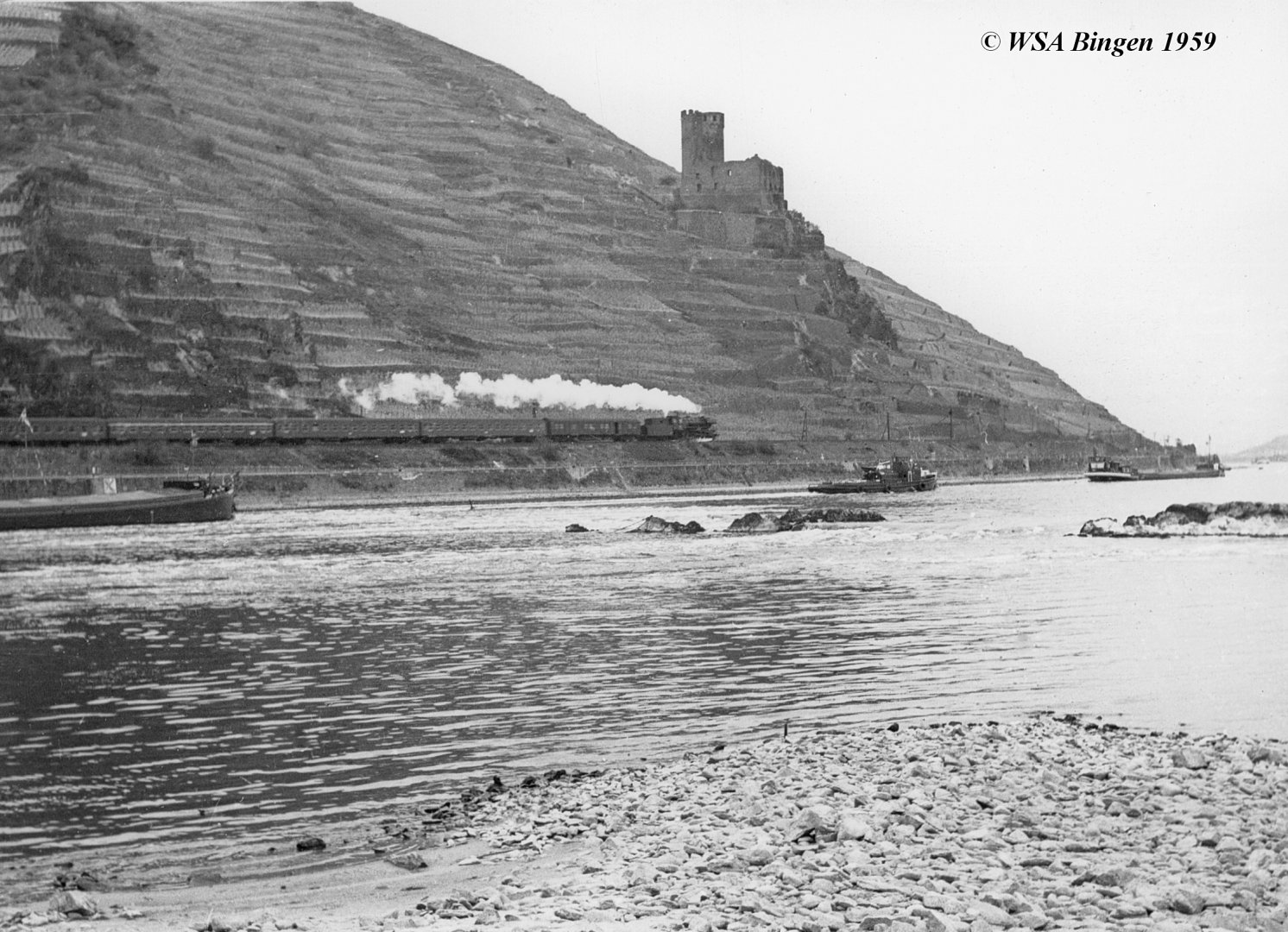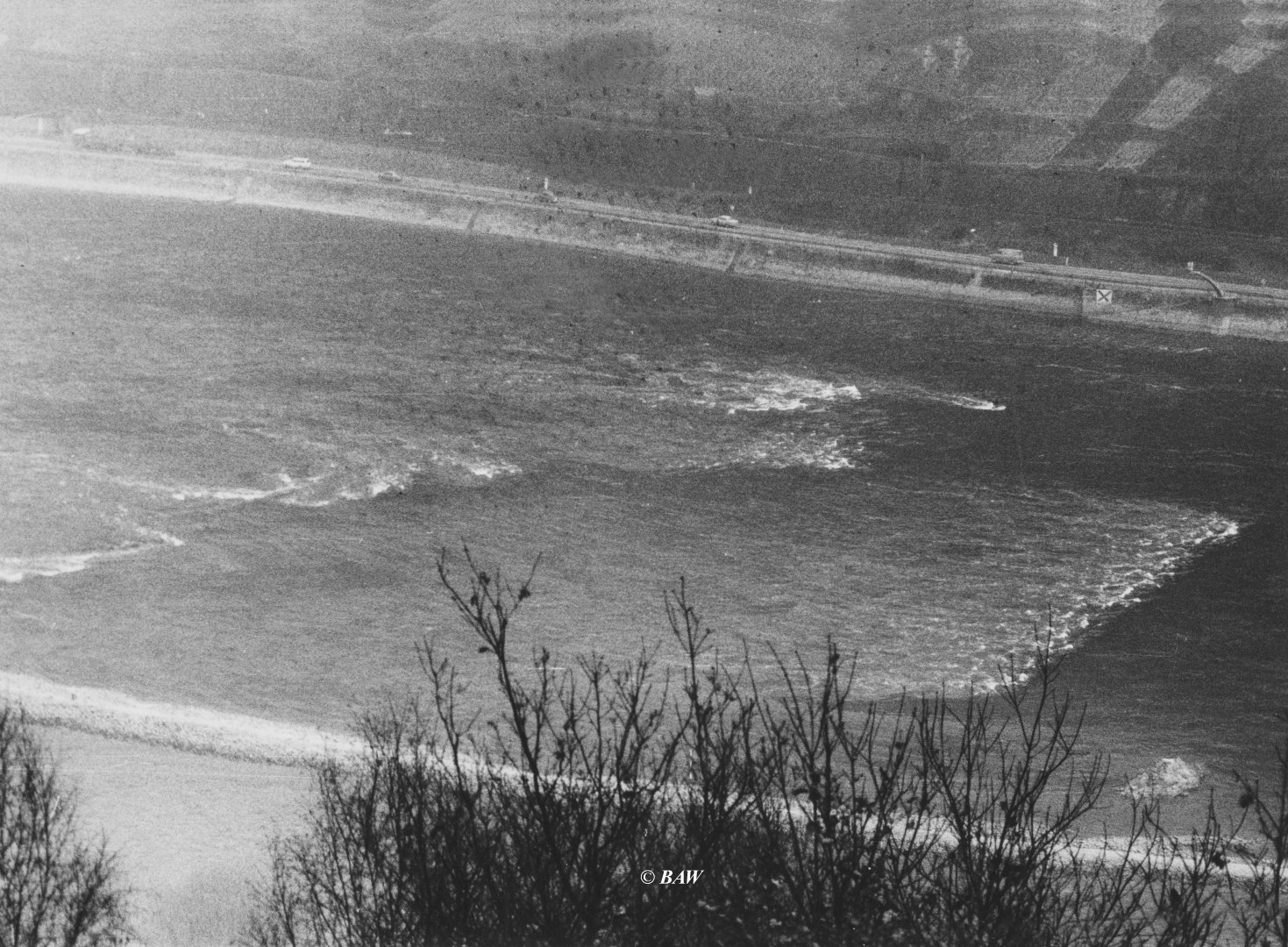 Zur Freigabe einer Fahrrinnentiefe von 2,10m unter GlW im unteren Bereich des Rheingau (Binger Reede / Rüdesheim) musste der Wasserspiegel daher um ca. 20cm erhöht werden, dazu wurde das in #18 dargestellte Leitwerk konzipiert. Eine detailliertere Beschreibung, auch zum Bauablauf, findet sich in meinem Beitrag "Die Nachregelung der Binger-Loch-Strecke" in ZfB Nr. 17 vom September 1994 (auch im HTG-Jahrbuch 1994 abgedruckt).