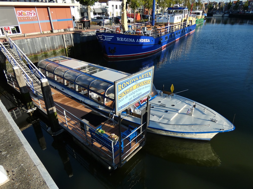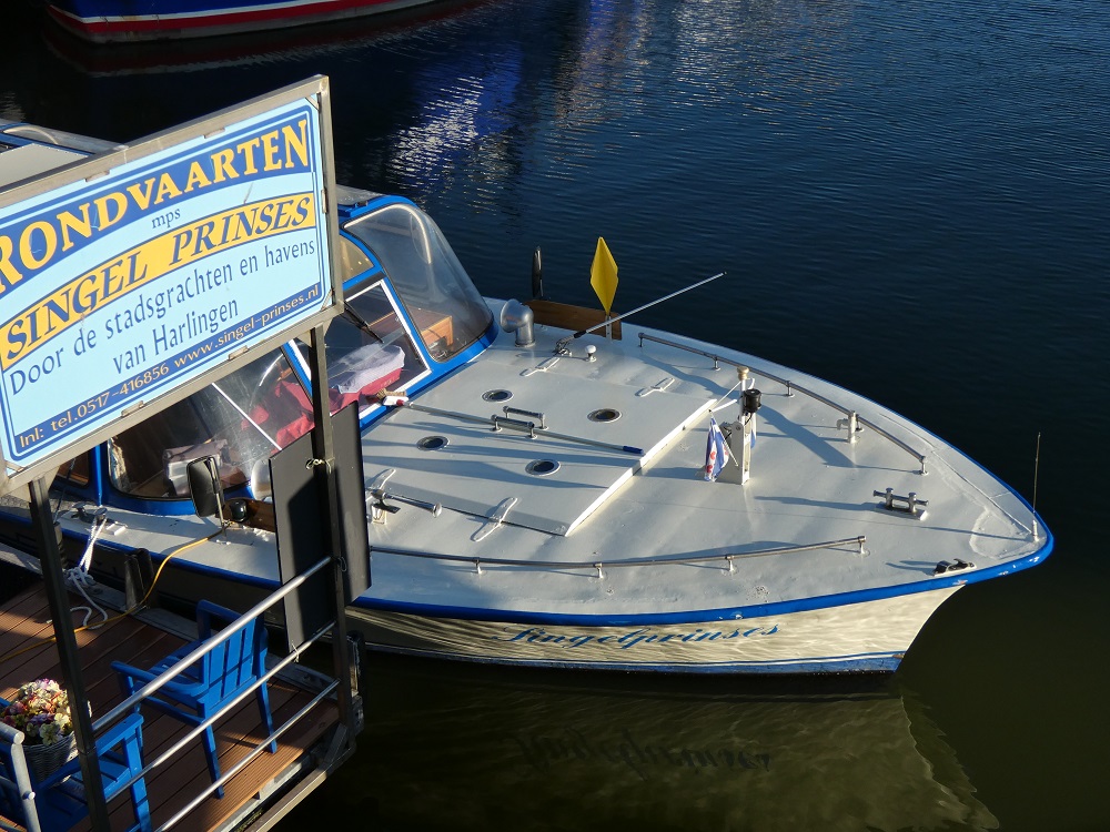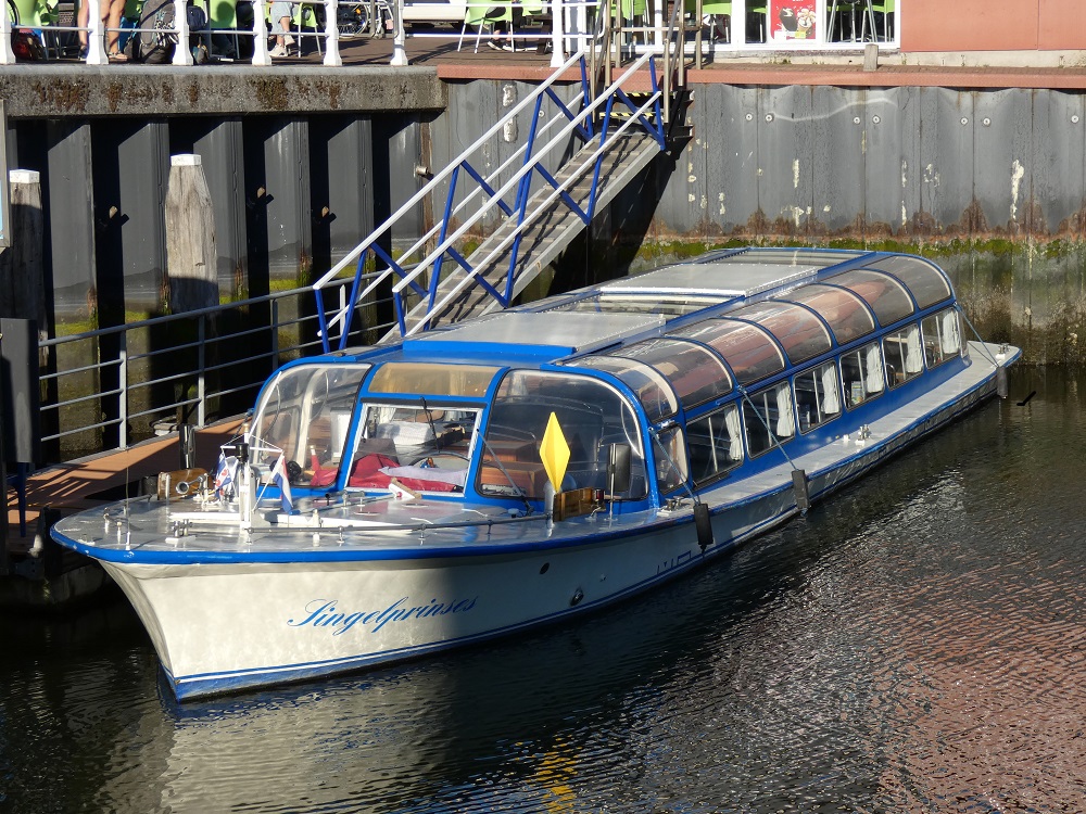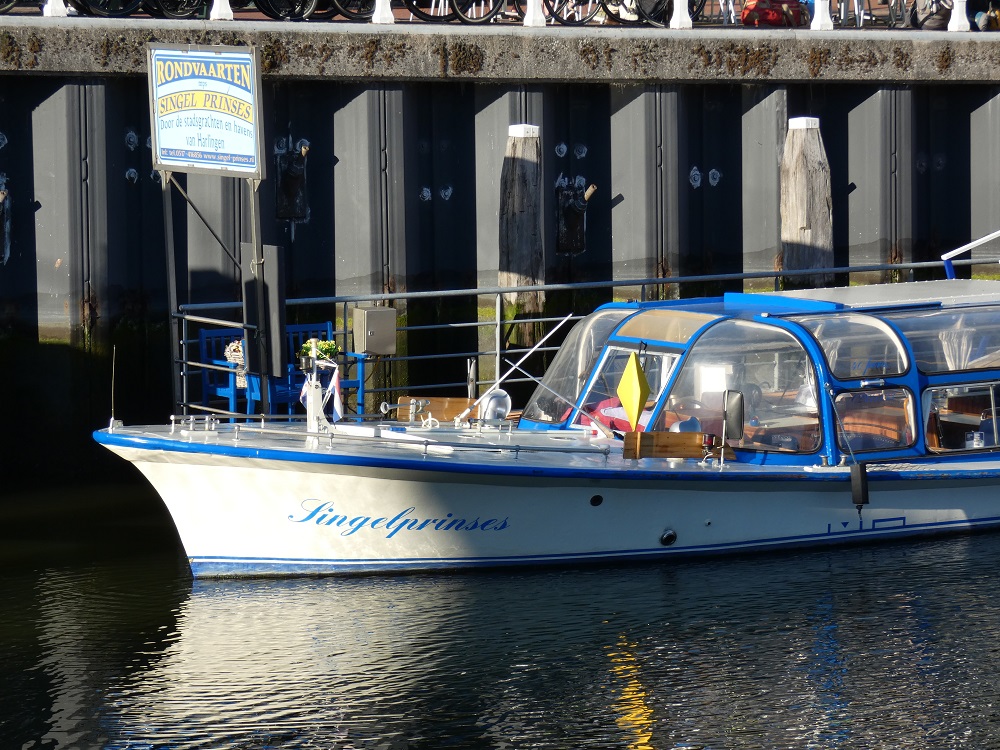 Das Grachtenboot SINGEL PRINSES sah ich am 28.08.2025 in Harlingen. Der Schiffsname steht jetzt zusammen geschrieben am Bug.