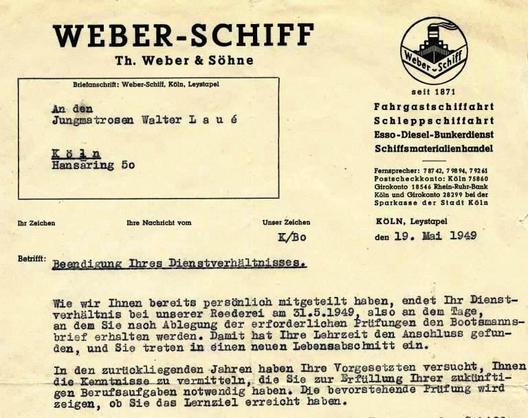 hier der Briefkopf als Ausschnitt von Th(eodor). Weber-Schiff und meine Verabschiedung aus der Lehre. "Ja, er hat sein Ziel erreicht", zur Hoffnung seiner Lehrherren.