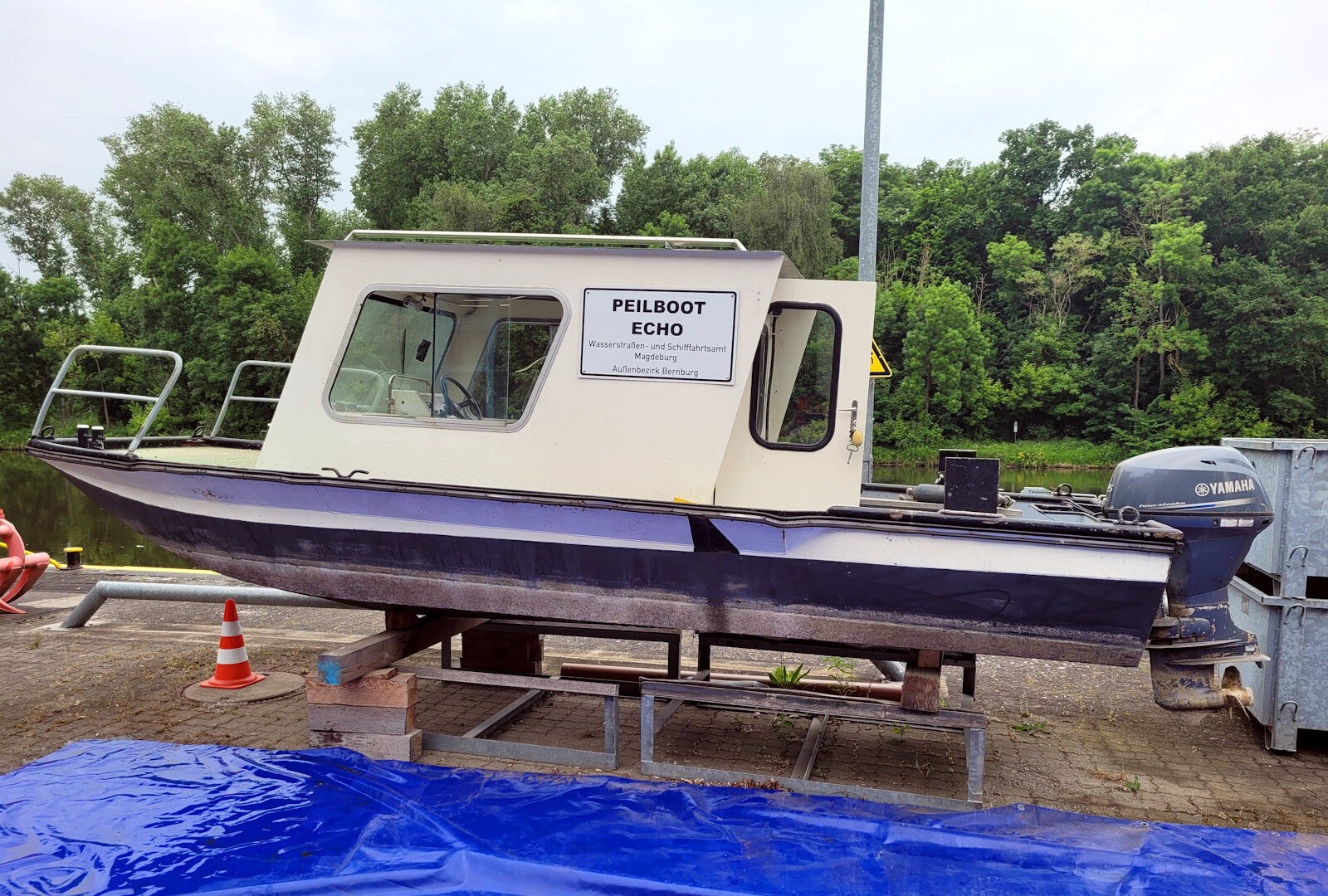 hier das kleine Peilboot "Echo" aus Bernburg auf Land liegend ...