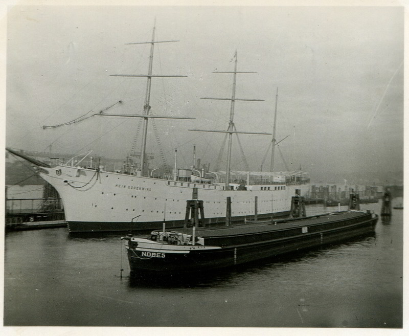 Es zeigt den Schleppkahn N.D.B.E. 5 der Neuen Deutsch-Böhmischen Elbeschiffahrts AG, Dresden, vor dem Jugendherbergsschiff