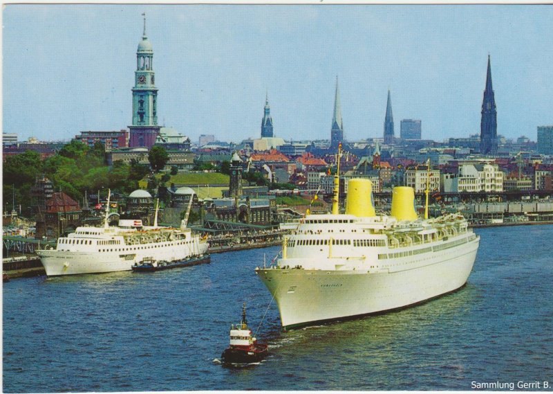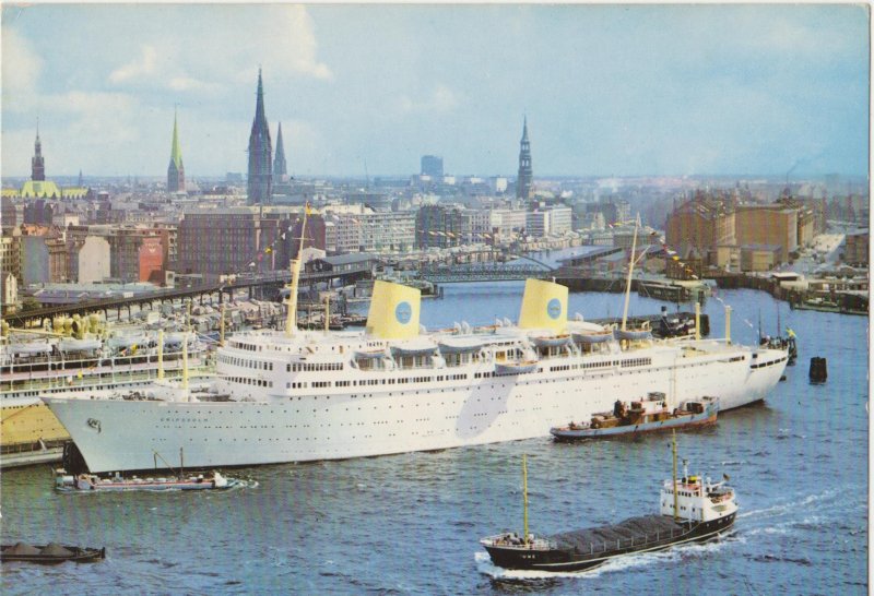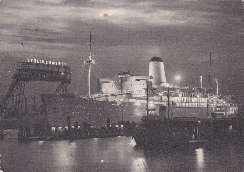 Bild 2) Passagierschiff ARCADIA, im Hintergrund die Stülckenwerft, gestempelt 1959