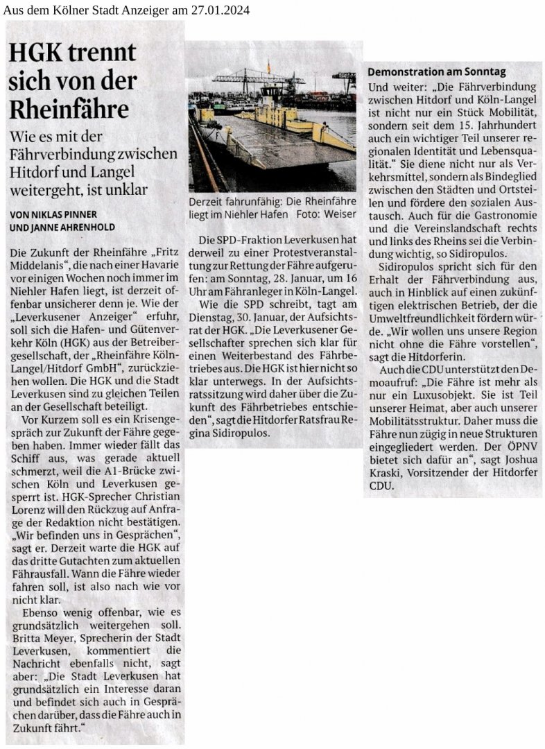 ...die Rheinfähre „Fritz Middelanis“ wird vom kommenden Mittwoch, 16. März 2022, bis voraussichtlich 22. März 2022 nicht zwischen Köln-Langel und Leverkusen-Hitdorf verkehren. Grund für die Betriebspause ist die notwendige Reparatur eines Treibgutschadens (siehe beigefügte Mitteilung der HGK).