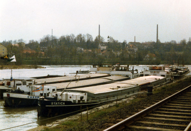 noch ein weiteres 'Wimmelbild' vom Frühling 1988 im Bamberger Hafen bei einer Schifffahrtssperre - diesmal mit den Schiffen CARGO, DAHLENBURG 3, DEO VOLENTE, PELUDOS, REGNITZ und STATICA. In diesem Fall geht es um das zweite Schiff von rechts: CARGO, Ho. Rotterdam N, L 62.55, B 7.56, T 750, 2315308.