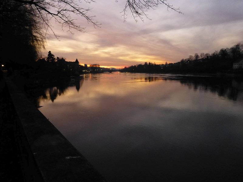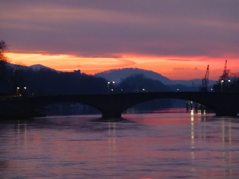 Abendstimmung, aufgenommen in Rheinfelden/Schweiz. Die Brücke verbindet Rheinfelden/Schweiz mit badisch Rheinfelden/Deutschland. Die beiden Hafenkrane gehören zum ersten Güterumschlagshafen der internationalen Rheinschifffahrt in Rheinfelden (Baden).