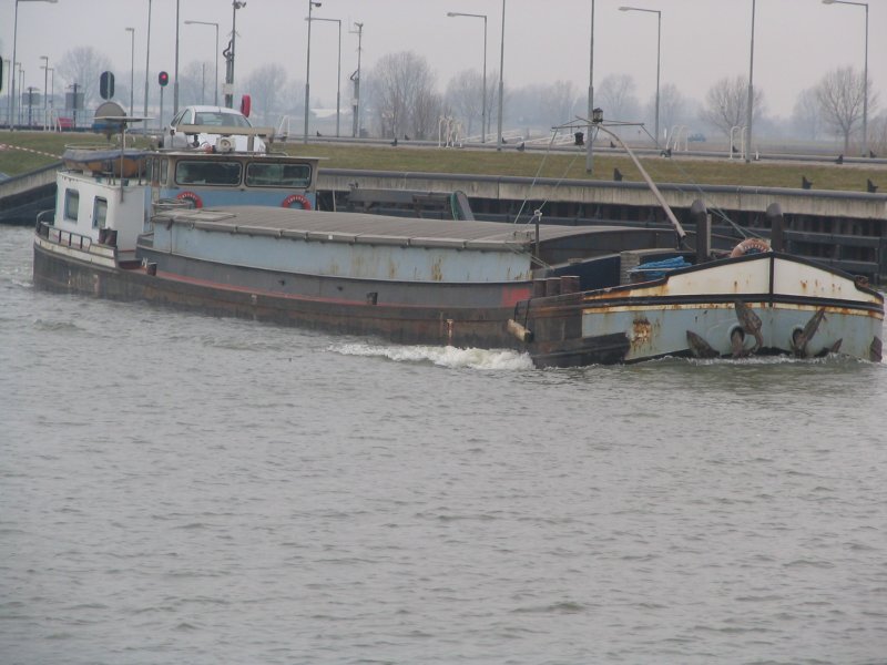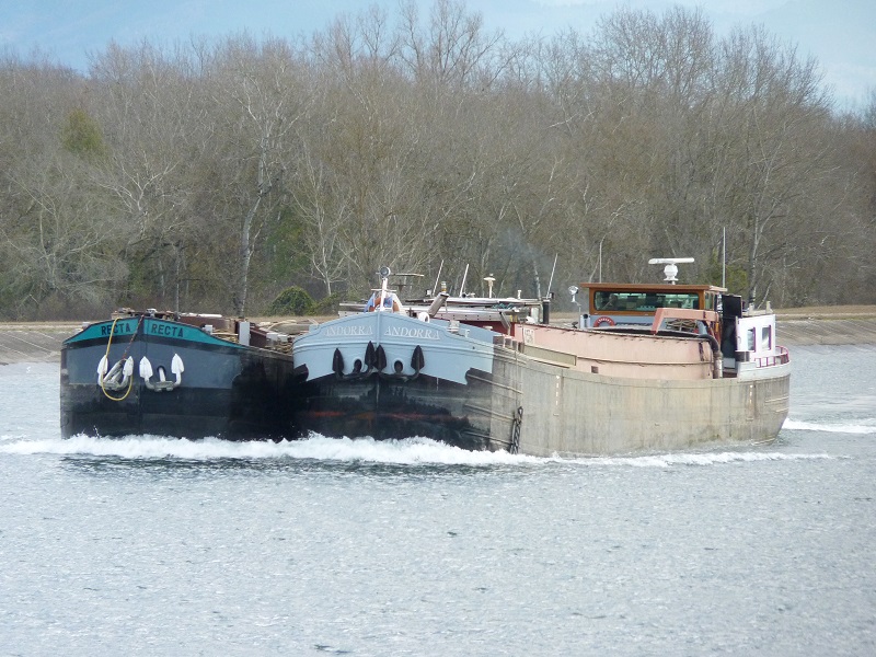 Die Péniche ANDORRA am 24.11.2018 zu Tal an der Schleuse Vogelgrün mit Péniche RECTA längseits.