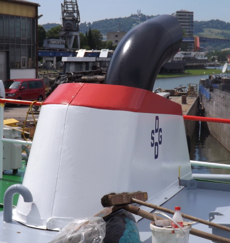 Nun sind Schiffsname am Aufbau und DDSG Emblem am Kamin angebracht !