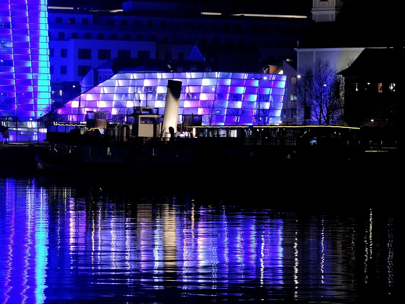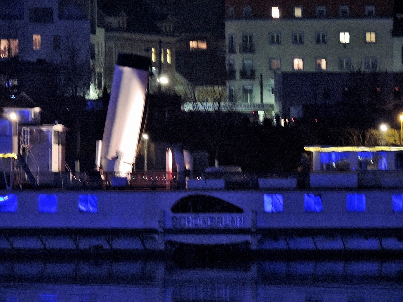 Kamin vom ehemaligen DDSG DS Schönbrunn bei Nacht.