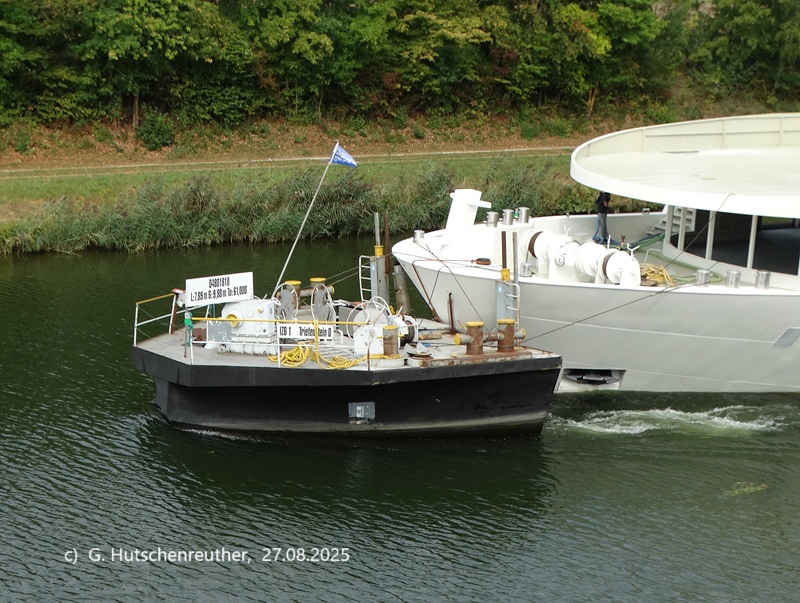 Die Kopfbarge bzw. wie es an der Donau heißt mobile Bugstrahl-Ruder-Anlage IZB 1 vorgekoppelt am vom MSS BROEDERTROUW 2 geschobenen Kabinenschiff-Kasko AMADEUS AUREA.