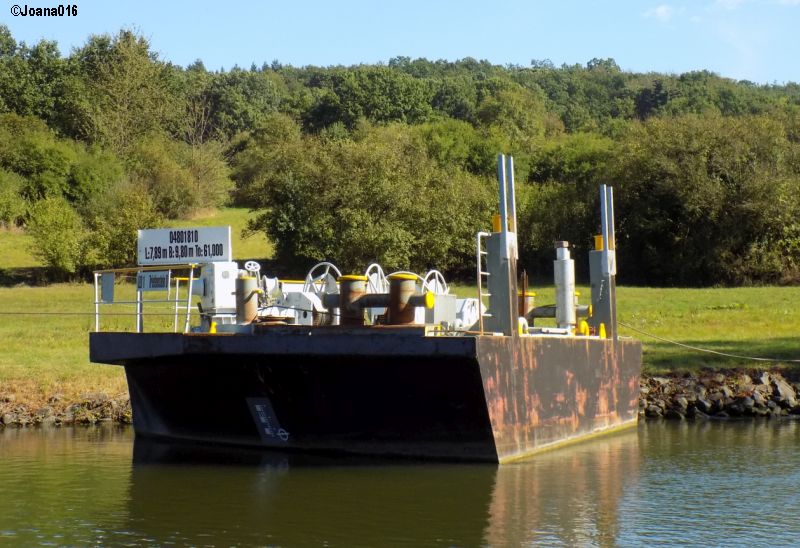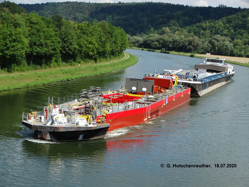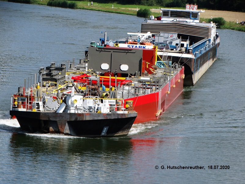Die Kopfbarge bzw. wie es an der Donau heißt mobile Bugstrahl-Ruder-Anlage IZB 1 vorgekoppelt am vom MGSS STARK geschobenen Baggerponton BEAVER BN 04051.