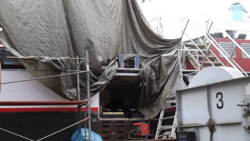 FGS. "RENATE" am 8. Juni 2020 noch am Helling mit offener Bordwand.
