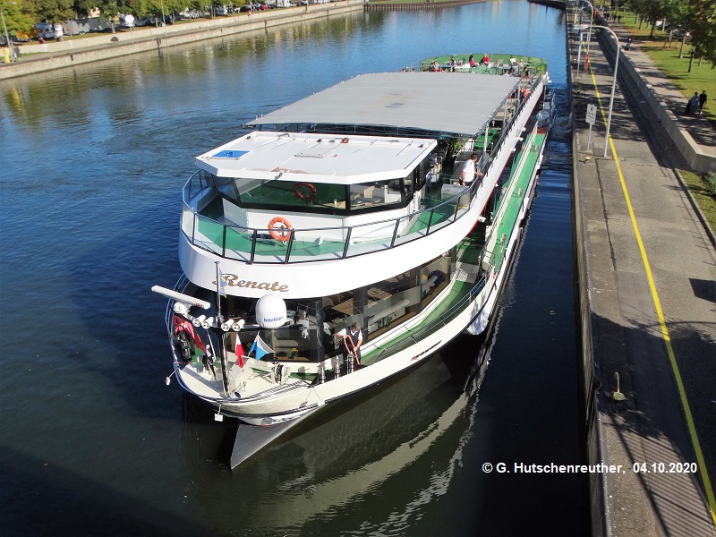 Die Bilder: MFS RENATE heute beim Ablegen und der Rückfahrt nach Kelheim im Oberwasser der Schleuse Regensburg.