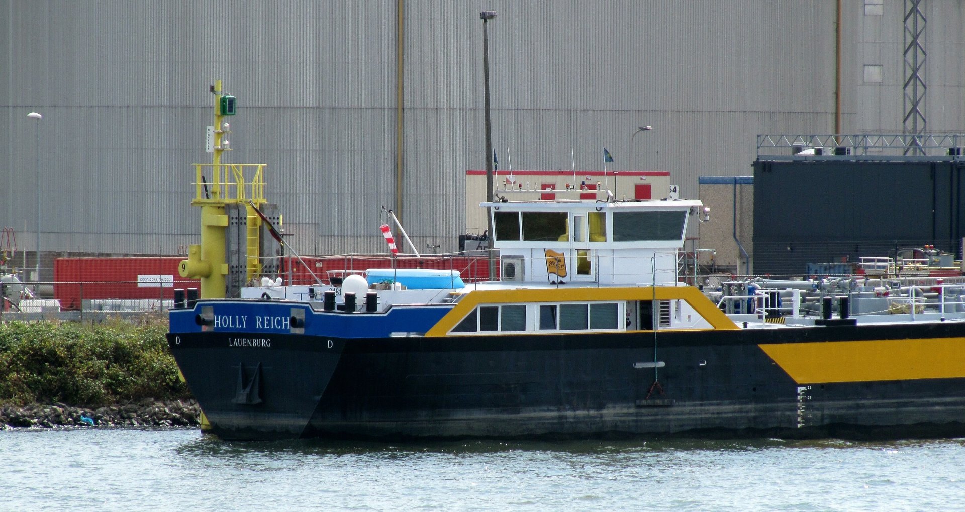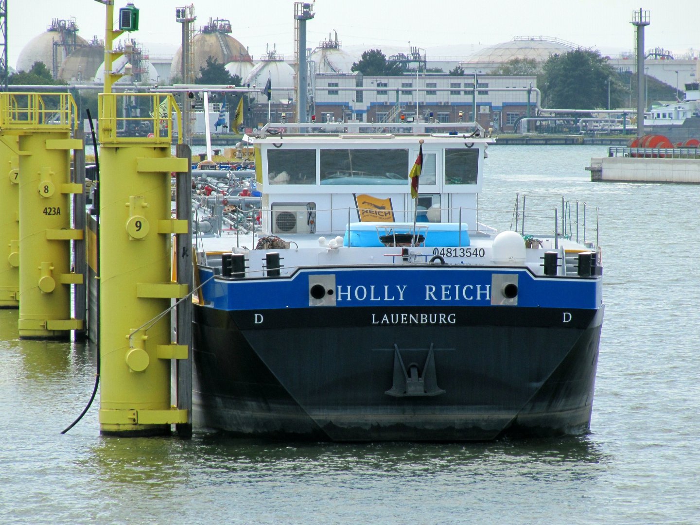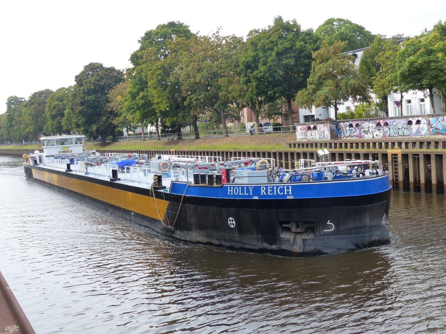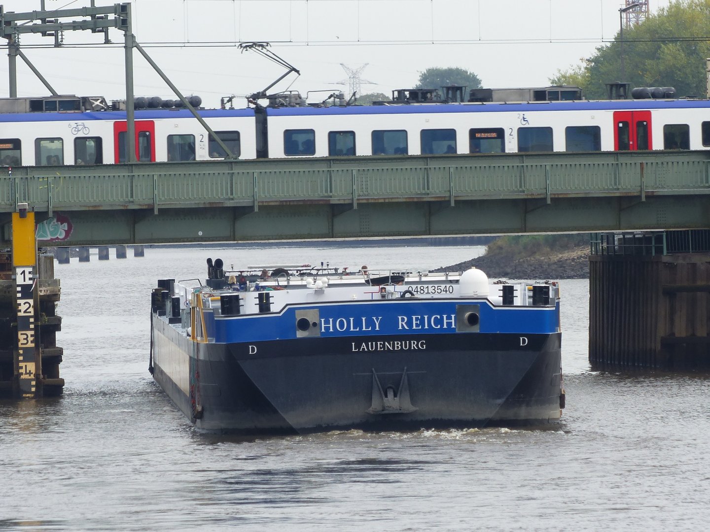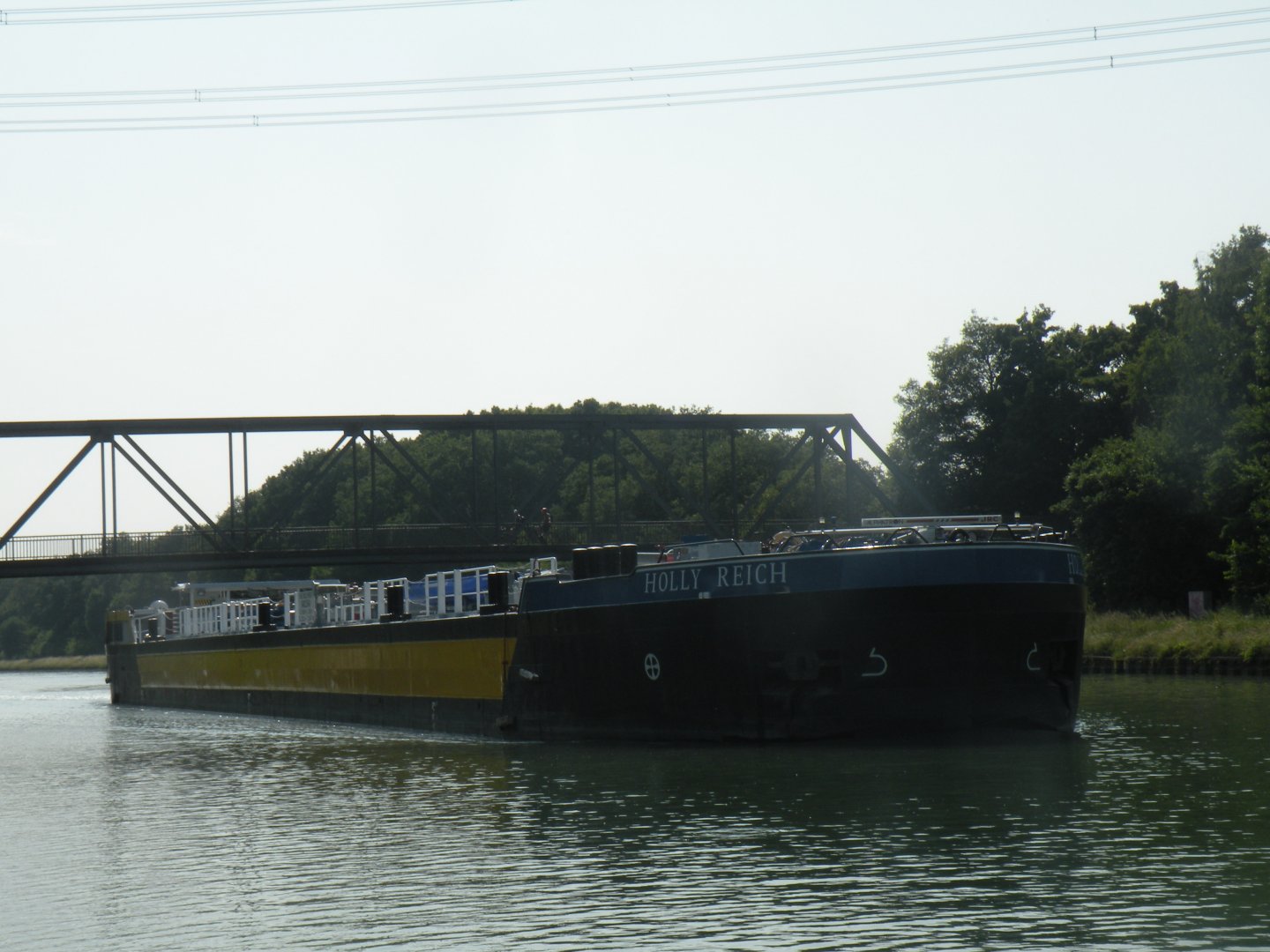TMS HOLLY REICH eine Woche später (#30) beladen auf dem Weg zur Weser; vom Küstenkanal in die Hunte und bei Niedrigwasser mit genügend Platz unter der geschlossenen Südöffnung der Eisenbahnbrücke Oldenburg!